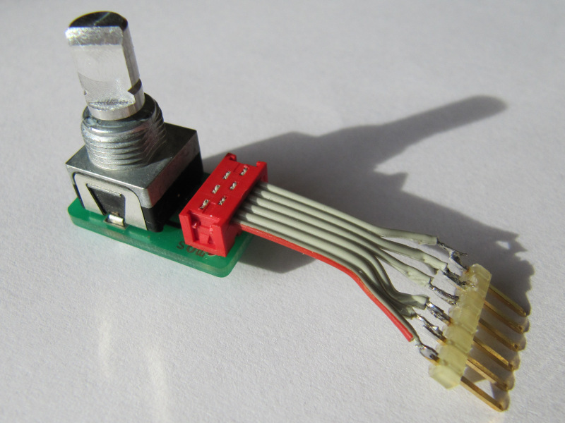 Im Bild: Der Anschluß des mechanischen Encoders, ebenfalls mit den Phasen-Signalen an Pins 9 und 10 und dem Taster an Pin 8.